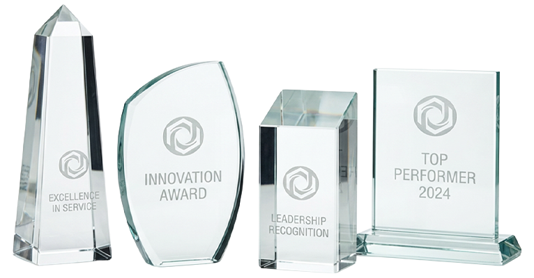 What personalization methods are used to brand crystal and other awards, and how do they affect detail and finish?